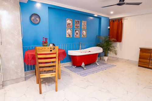 ✨ Overview Experience refined luxury in this stylish 1BHK in Chhatarpur, perfect for couples and young travelers seeking a private and upscale retreat. Designed with elegant interiors and premium imported fittings, the space offers a modern and sophisticated ambiance. Fully air-conditioned and located in a quiet yet well-connected area, this home ensures comfort, privacy, and convenience throughout your stay. 🛋️ Living Room The living room is both stylish and functional, featuring a TV for entertainment, a refrigerator, a spacious almirah for storage, and a comfortable sofa-cum-bed for relaxation or accommodating an extra guest. Soft lighting and curated décor enhance the warm, upscale feel of the space. 🛏️ Bedroom The bedroom provides a calm and inviting atmosphere with a comfortable bed, fresh linens, plush pillows, and soothing ambient lighting to ensure a restful and relaxing stay. 🍳 Kitchen The fully functional kitchen is ideal for light cooking, equipped with essential cookware, storage, and modern fittings for everyday convenience. 🚿 Bathroom The bathroom features sleek, modern fixtures designed for a clean, comfortable, and refreshing experience. 🌿 Balcony & Jacuzzi Step out onto your private balcony and unwind in the exclusive jacuzzi—perfect for relaxing mornings or peaceful evenings. ✨ Add-On Experiences 🌹 Bliss Package – ₹4,000 Perfect for intimate surprises and special evenings. Includes a romantic rose petal jacuzzi setup, soothing bath oil experience, elegant candlelight dinner setup, authentic Italian dinner for two (Veg/Non-Veg), and a complimentary flower bouquet. 💡 A refundable ₹1,500 deposit is required for premium crockery. 🥂 Luxury Romance Package – ₹7,000 For the ultimate indulgence and celebration of love. Includes full room décor with roses and balloons, a pre-set temperature-controlled ambiance, a luxurious jacuzzi experience with bath bomb and essential oils, an intimate candlelight dinner setup, Italian dinner for two, and a bottle of premium red or white wine. 📌 Please inform us 2–3 days in advance for any package bookings. Last-minute arrangements are not available. 🏡 House Rules & Important Information The main entrance door remains locked at night; deliveries must be collected from downstairs. Caretaker assistance is available between 12 PM – 6 PM; hosts are always reachable. The property is couple-friendly—drinking and smoking are allowed inside the room; however, loud music and property damage are strictly prohibited. Standard check-in time is 12 PM; bookings made after this time will be accommodated within 30 minutes. Late check-ins may be chargeable. Valid government ID proof is mandatory for all guests and must be uploaded prior to arrival for a smooth self check-in process. Playing Holi or using colors inside the property is strictly prohibited; violations will incur additional cleaning or damage charges. All check-in details will be shared after 10 AM on the day of arrival.